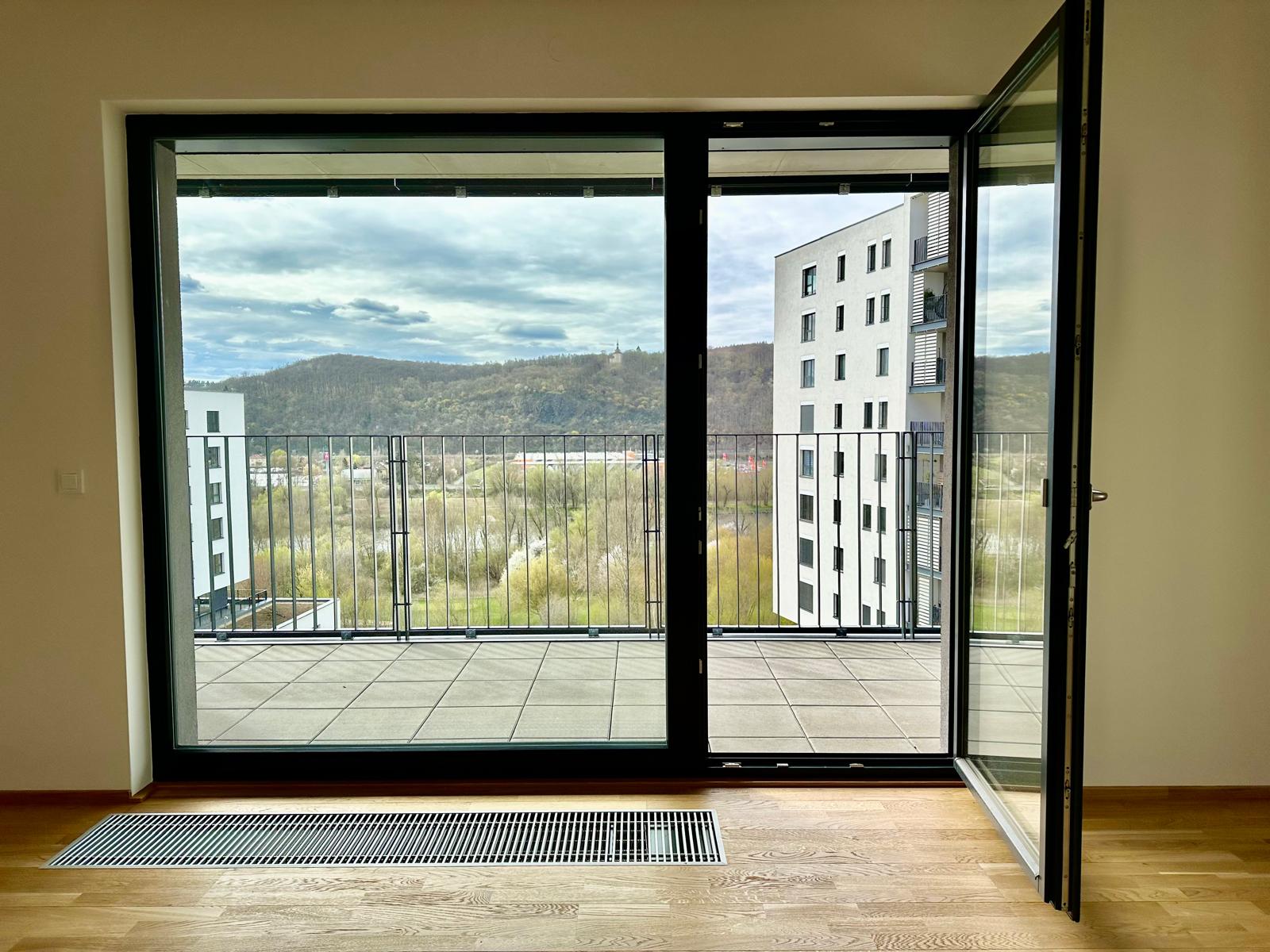 K bytu patří garážové stání a sklep. Standard zahrnuje rekuperaci, dřevěné podlahy, venkovní elektrické žaluzie na největším západním okně, bezpečnostní dveře a vybavený balkon (osvětlení, zásuvka).
